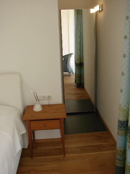 Auf dem Weg ins eigene kleine Badezimmer - ein Kleiderschrank mit Schiebetüren und Spiegel.