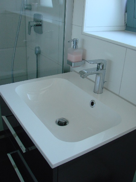 Das kleine Bad hinter dem Schlafzimmer - mit begehbarer Dusche, Waschebecken und WC.